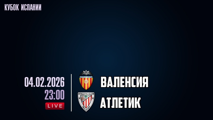 4 февраля 2026 года, мы предлагаем посмотреть онлайн трансляцию футбольного матча между футбольным клубом Валенсия и футбольным клубом Атлетик, проходящего в рамках Кубка Испании.