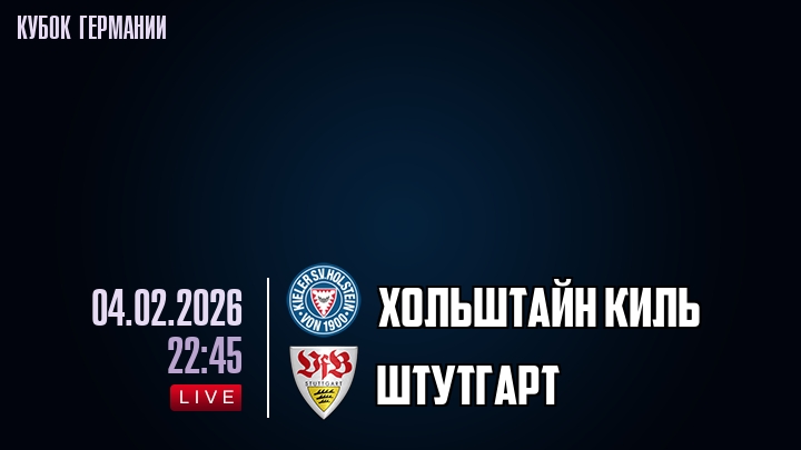 4 февраля 2026 года, мы предлагаем посмотреть онлайн трансляцию футбольного матча между футбольным клубом Хольштайн Киль и футбольным клубом Штутгарт, проходящего в рамках Кубка Германии.