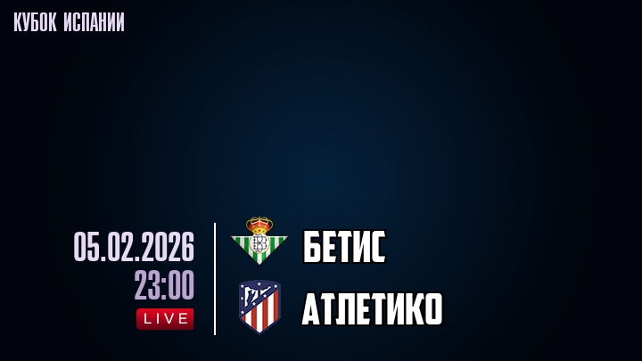 5 февраля 2026 года, мы предлагаем посмотреть онлайн трансляцию футбольного матча между футбольным клубом Бетис и футбольным клубом Атлетико, проходящего в рамках Кубка Испании.