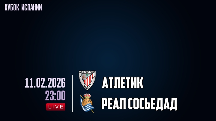 11 февраля 2026 года, мы предлагаем посмотреть онлайн трансляцию футбольного матча между футбольным клубом Атлетик и футбольным клубом Реал Сосьедад, проходящего в рамках Кубка Испании.
