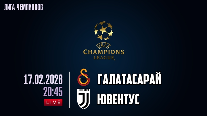 17 февраля 2026 года, мы предлагаем посмотреть онлайн трансляцию футбольного матча между футбольным клубом Галатасарай и футбольным клубом Ювентус, проходящего в рамках Лиги Чемпионов.