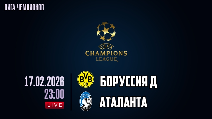 17 февраля 2026 года, мы предлагаем посмотреть онлайн трансляцию футбольного матча между футбольным клубом Боруссия Д и футбольным клубом Аталанта, проходящего в рамках Лиги Чемпионов.