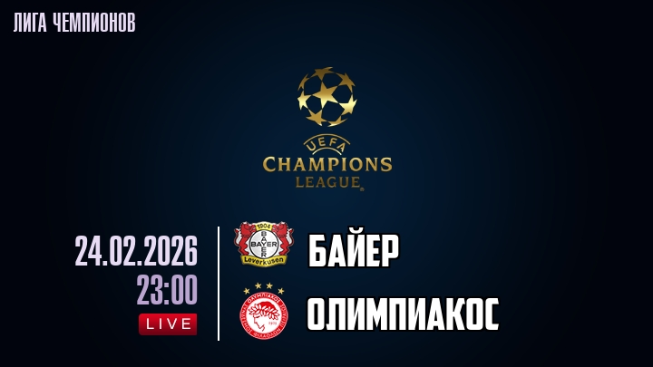 24 февраля 2026 года, мы предлагаем посмотреть онлайн трансляцию футбольного матча между футбольным клубом Байер и футбольным клубом Олимпиакос, проходящего в рамках Лиги Чемпионов.