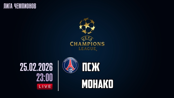 25 февраля 2026 года, мы предлагаем посмотреть онлайн трансляцию футбольного матча между футбольным клубом ПСЖ и футбольным клубом Монако, проходящего в рамках Лиги Чемпионов.