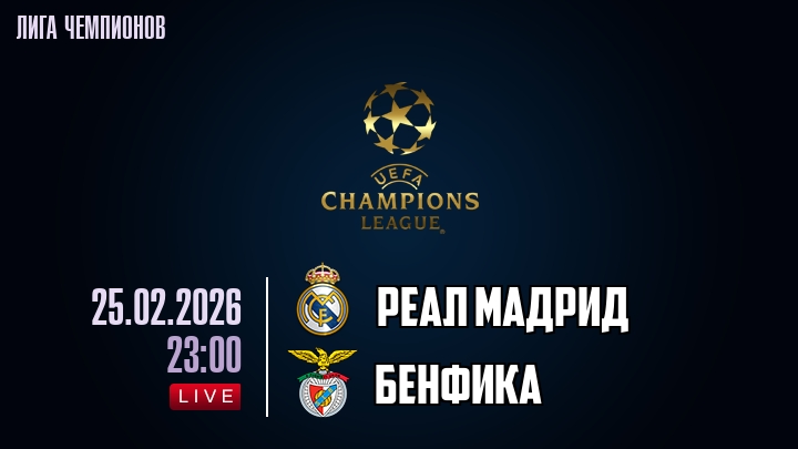 25 февраля 2026 года, мы предлагаем посмотреть онлайн трансляцию футбольного матча между футбольным клубом Реал Мадрид и футбольным клубом Бенфика, проходящего в рамках Лиги Чемпионов.