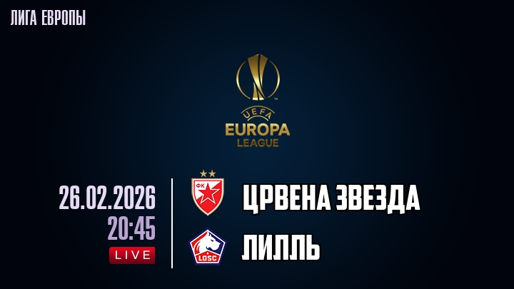 26 февраля 2026 года, мы предлагаем посмотреть онлайн трансляцию футбольного матча между футбольным клубом Црвена Звезда и футбольным клубом Лилль, проходящего в рамках Лиги Европы.
