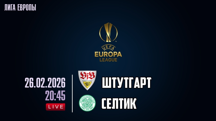 26 февраля 2026 года, мы предлагаем посмотреть онлайн трансляцию футбольного матча между футбольным клубом Штутгарт и футбольным клубом Селтик, проходящего в рамках Лиги Европы.
