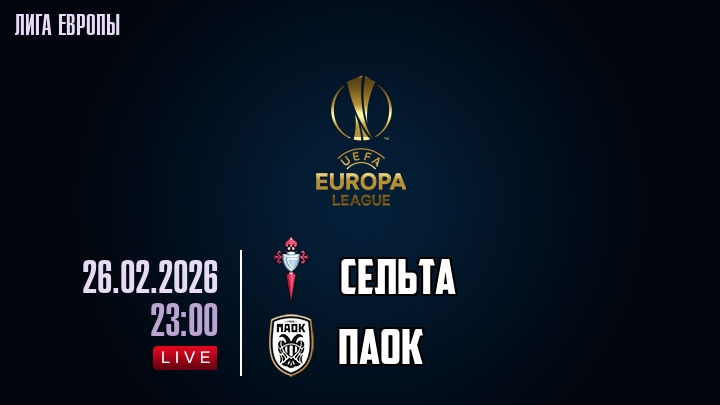 26 февраля 2026 года, мы предлагаем посмотреть онлайн трансляцию футбольного матча между футбольным клубом Сельта и футбольным клубом ПАОК, проходящего в рамках Лиги Европы.