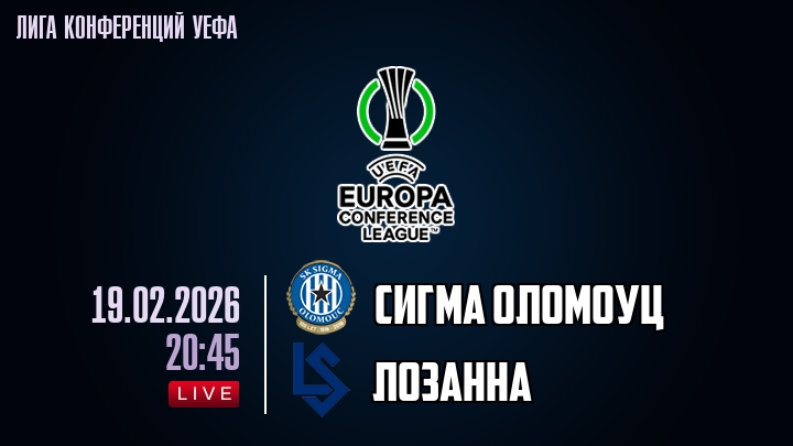 19 февраля 2026 года, мы предлагаем посмотреть онлайн трансляцию футбольного матча между футбольным клубом Сигма Оломоуц и футбольным клубом Лозанна, проходящего в рамках Лиги конференций УЕФА.