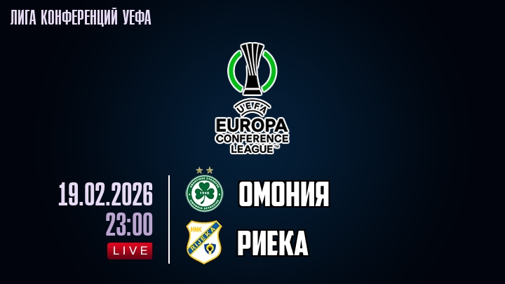 19 февраля 2026 года, мы предлагаем посмотреть онлайн трансляцию футбольного матча между футбольным клубом Омония и футбольным клубом Риека, проходящего в рамках Лиги конференций УЕФА.