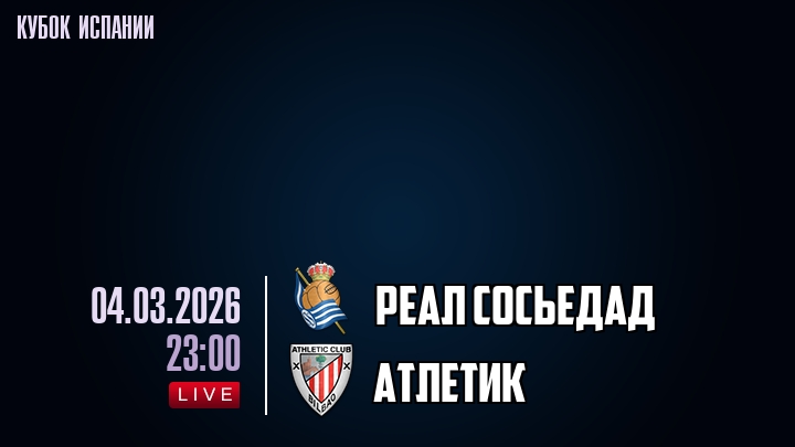 4 марта 2026 года, мы предлагаем посмотреть онлайн трансляцию футбольного матча между футбольным клубом Реал Сосьедад и футбольным клубом Атлетик, проходящего в рамках Кубка Испании.