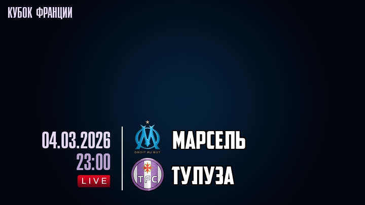 4 марта 2026 года, мы предлагаем посмотреть онлайн трансляцию футбольного матча между футбольным клубом Марсель и футбольным клубом Тулуза, проходящего в рамках Кубка Франции.