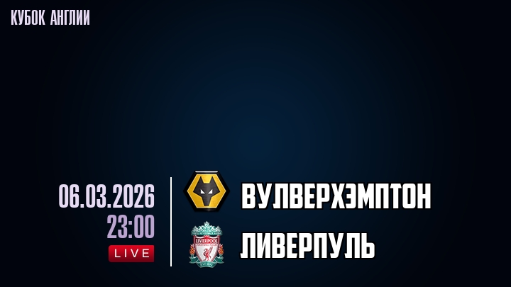 6 марта 2026 года, мы предлагаем посмотреть онлайн трансляцию футбольного матча между футбольным клубом Вулверхэмптон и футбольным клубом Ливерпуль, проходящего в рамках Кубка Англии.