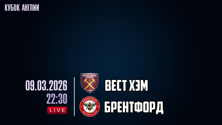9 марта 2026 года, мы предлагаем посмотреть онлайн трансляцию футбольного матча между футбольным клубом Вест Хэм и футбольным клубом Брентфорд, проходящего в рамках Кубка Англии.