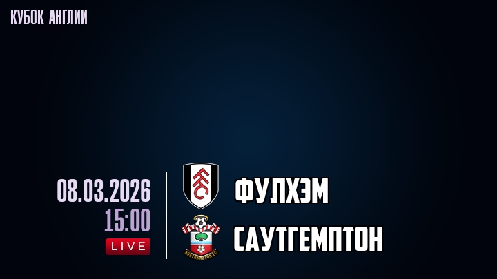 8 марта 2026 года, мы предлагаем посмотреть онлайн трансляцию футбольного матча между футбольным клубом Фулхэм и футбольным клубом Саутгемптон, проходящего в рамках Кубка Англии.