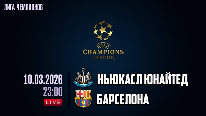 10 марта 2026 года, мы предлагаем посмотреть онлайн трансляцию футбольного матча между футбольным клубом Ньюкасл Юнайтед и футбольным клубом Барселона, проходящего в рамках Лиги Чемпионов.