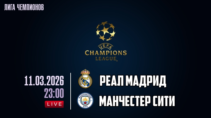 11 марта 2026 года, мы предлагаем посмотреть онлайн трансляцию футбольного матча между футбольным клубом Реал Мадрид и футбольным клубом Манчестер Сити, проходящего в рамках Лиги Чемпионов.