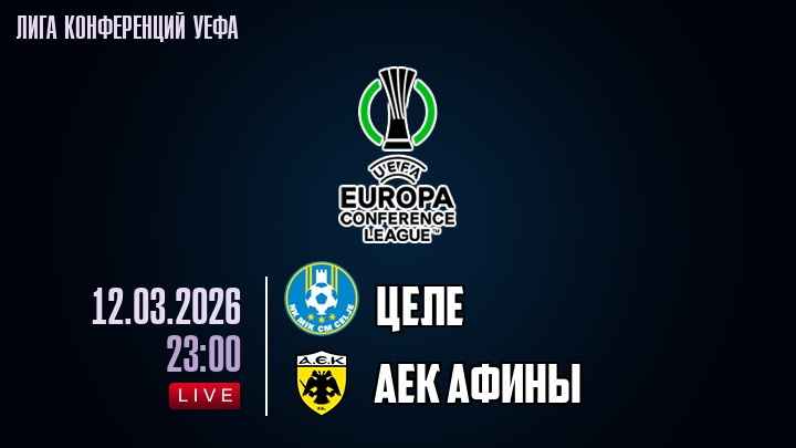 12 марта 2026 года, мы предлагаем посмотреть онлайн трансляцию футбольного матча между футбольным клубом Целе и футбольным клубом АЕК Афины, проходящего в рамках Лиги конференций УЕФА.