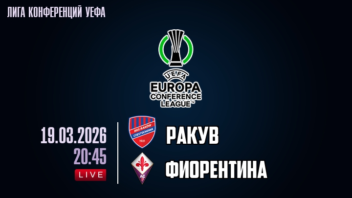 19 марта 2026 года, мы предлагаем посмотреть онлайн трансляцию футбольного матча между футбольным клубом Ракув и футбольным клубом Фиорентина, проходящего в рамках Лиги конференций УЕФА.
