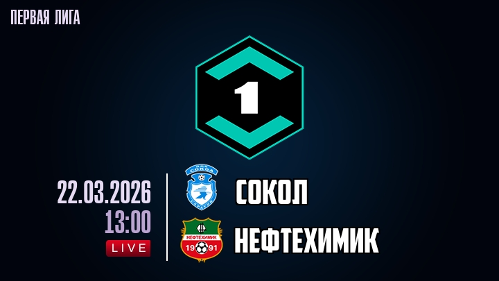 22 марта 2026 года, мы предлагаем посмотреть онлайн трансляцию футбольного матча между футбольным клубом Сокол и футбольным клубом Нефтехимик, проходящего в рамках Первой лиги.