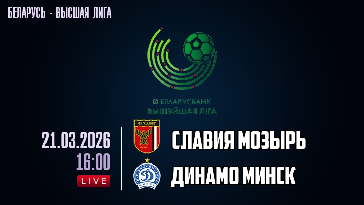 21 марта 2026 года, мы предлагаем посмотреть онлайн трансляцию футбольного матча между футбольным клубом Славия Мозырь и футбольным клубом Динамо Минск, проходящего в рамках Высшей лиги Беларуси.