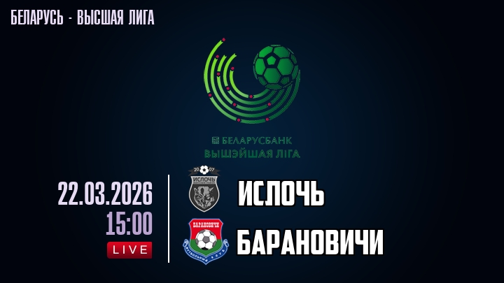 22 марта 2026 года, мы предлагаем посмотреть онлайн трансляцию футбольного матча между футбольным клубом Ислочь и футбольным клубом Барановичи, проходящего в рамках Высшей лиги Беларуси.