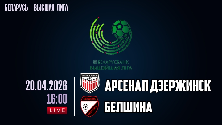 20 апреля 2026 года, мы предлагаем посмотреть онлайн трансляцию футбольного матча между футбольным клубом Арсенал Дзержинск и футбольным клубом Белшина, проходящего в рамках Высшей лиги Беларуси.