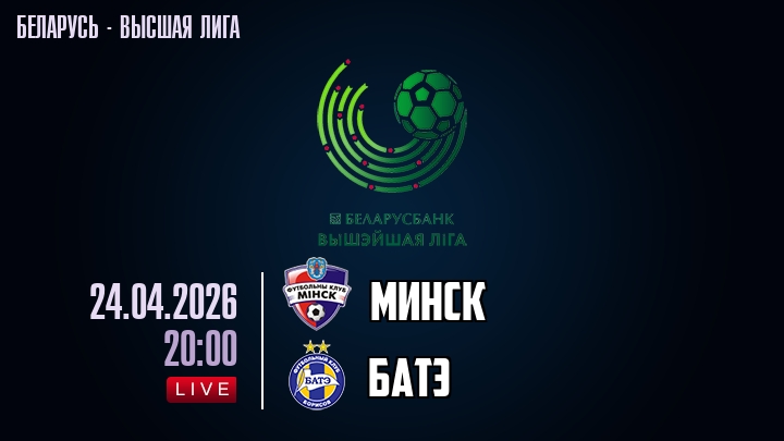 24 апреля 2026 года, мы предлагаем посмотреть онлайн трансляцию футбольного матча между футбольным клубом Минск и футбольным клубом БАТЭ, проходящего в рамках Высшей лиги Беларуси.