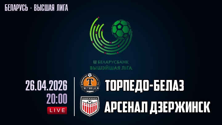 26 апреля 2026 года, мы предлагаем посмотреть онлайн трансляцию футбольного матча между футбольным клубом Торпедо-БелАЗ и футбольным клубом Арсенал Дзержинск, проходящего в рамках Высшей лиги Беларуси.