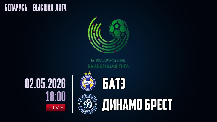 2 мая 2026 года, мы предлагаем посмотреть онлайн трансляцию футбольного матча между футбольным клубом БАТЭ и футбольным клубом Динамо Брест, проходящего в рамках Высшей лиги Беларуси.