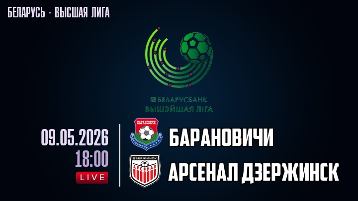 9 мая 2026 года, мы предлагаем посмотреть онлайн трансляцию футбольного матча между футбольным клубом Барановичи и футбольным клубом Арсенал Дзержинск, проходящего в рамках Высшей лиги Беларуси.