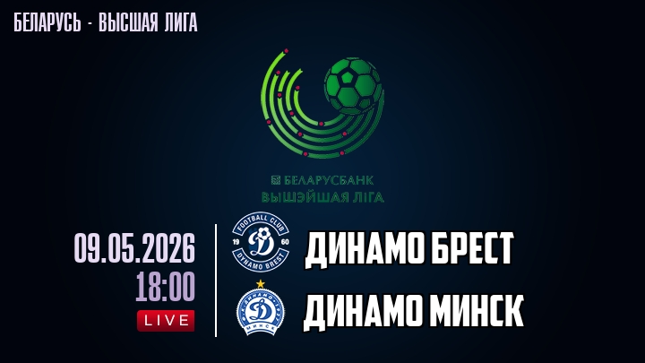 9 мая 2026 года, мы предлагаем посмотреть онлайн трансляцию футбольного матча между футбольным клубом Динамо Брест и футбольным клубом Динамо Минск, проходящего в рамках Высшей лиги Беларуси.