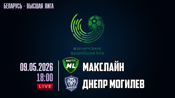 9 мая 2026 года, мы предлагаем посмотреть онлайн трансляцию футбольного матча между футбольным клубом Макслайн и футбольным клубом Днепр Могилев, проходящего в рамках Высшей лиги Беларуси.