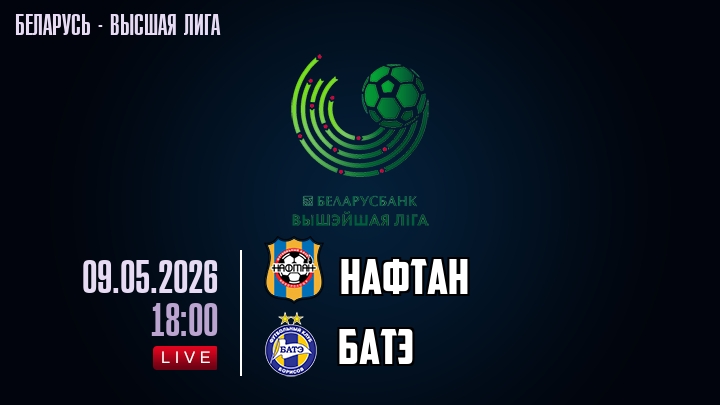 9 мая 2026 года, мы предлагаем посмотреть онлайн трансляцию футбольного матча между футбольным клубом Нафтан и футбольным клубом БАТЭ, проходящего в рамках Высшей лиги Беларуси.