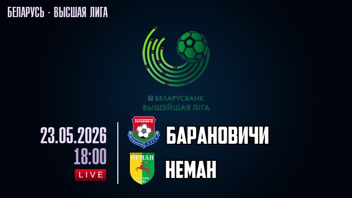 23 мая 2026 года, мы предлагаем посмотреть онлайн трансляцию футбольного матча между футбольным клубом Барановичи и футбольным клубом Неман, проходящего в рамках Высшей лиги Беларуси.