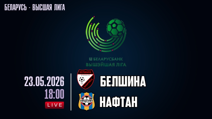 23 мая 2026 года, мы предлагаем посмотреть онлайн трансляцию футбольного матча между футбольным клубом Белшина и футбольным клубом Нафтан, проходящего в рамках Высшей лиги Беларуси.