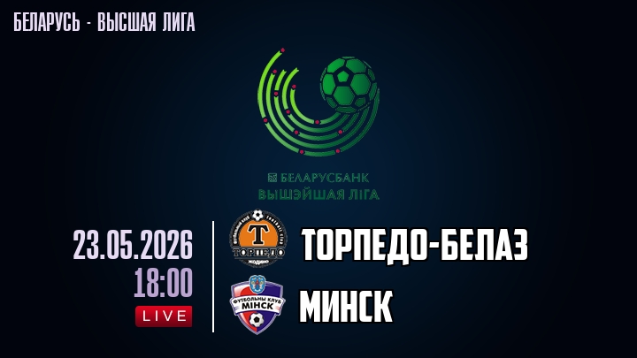 23 мая 2026 года, мы предлагаем посмотреть онлайн трансляцию футбольного матча между футбольным клубом Торпедо-БелАЗ и футбольным клубом Минск, проходящего в рамках Высшей лиги Беларуси.