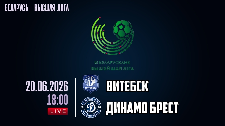 20 июня 2026 года, мы предлагаем посмотреть онлайн трансляцию футбольного матча между футбольным клубом Витебск и футбольным клубом Динамо Брест, проходящего в рамках Высшей лиги Беларуси.