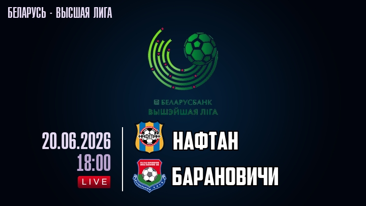 20 июня 2026 года, мы предлагаем посмотреть онлайн трансляцию футбольного матча между футбольным клубом Нафтан и футбольным клубом Барановичи, проходящего в рамках Высшей лиги Беларуси.