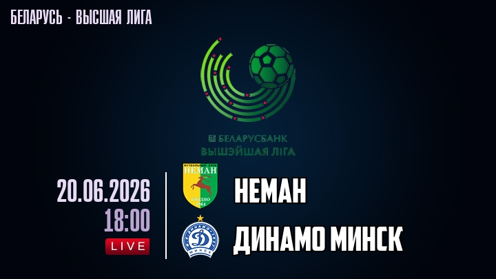 20 июня 2026 года, мы предлагаем посмотреть онлайн трансляцию футбольного матча между футбольным клубом Неман и футбольным клубом Динамо Минск, проходящего в рамках Высшей лиги Беларуси.