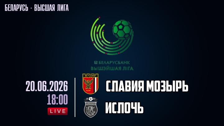 20 июня 2026 года, мы предлагаем посмотреть онлайн трансляцию футбольного матча между футбольным клубом Славия Мозырь и футбольным клубом Ислочь, проходящего в рамках Высшей лиги Беларуси.
