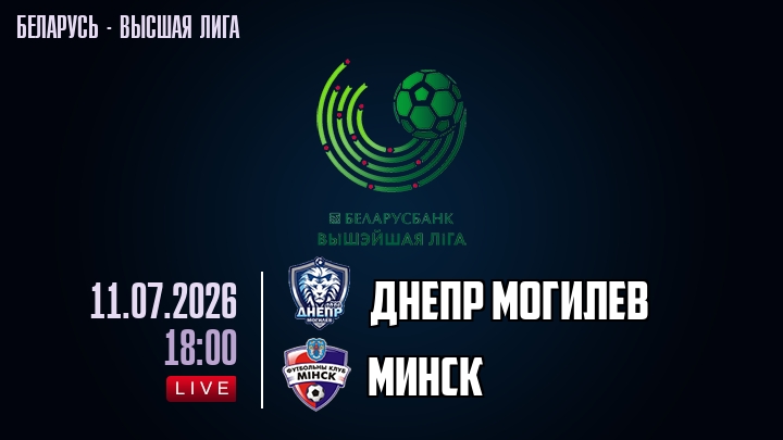 11 июля 2026 года, мы предлагаем посмотреть онлайн трансляцию футбольного матча между футбольным клубом Днепр Могилев и футбольным клубом Минск, проходящего в рамках Высшей лиги Беларуси.