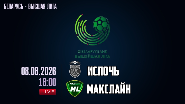 8 августа 2026 года, мы предлагаем посмотреть онлайн трансляцию футбольного матча между футбольным клубом Ислочь и футбольным клубом Макслайн, проходящего в рамках Высшей лиги Беларуси.