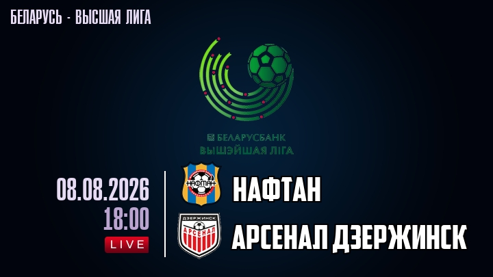 8 августа 2026 года, мы предлагаем посмотреть онлайн трансляцию футбольного матча между футбольным клубом Нафтан и футбольным клубом Арсенал Дзержинск, проходящего в рамках Высшей лиги Беларуси.