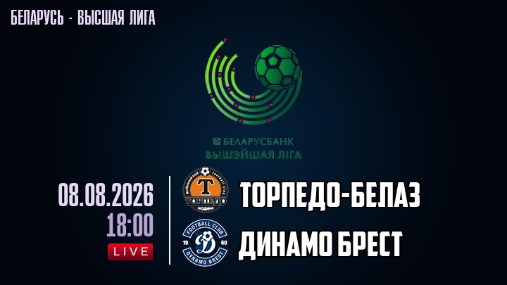 8 августа 2026 года, мы предлагаем посмотреть онлайн трансляцию футбольного матча между футбольным клубом Торпедо-БелАЗ и футбольным клубом Динамо Брест, проходящего в рамках Высшей лиги Беларуси.
