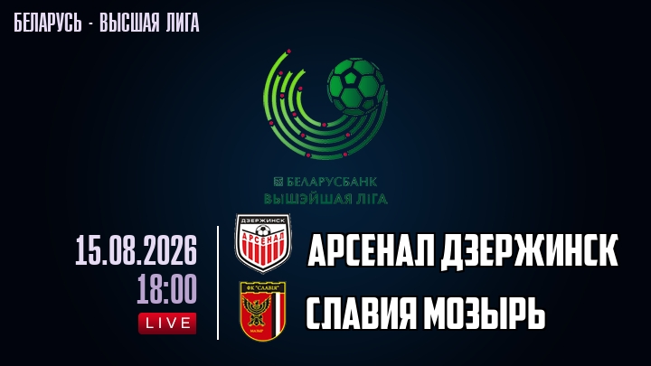 15 августа 2026 года, мы предлагаем посмотреть онлайн трансляцию футбольного матча между футбольным клубом Арсенал Дзержинск и футбольным клубом Славия Мозырь, проходящего в рамках Высшей лиги Беларуси.