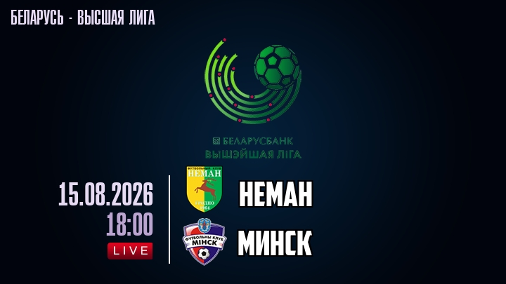 15 августа 2026 года, мы предлагаем посмотреть онлайн трансляцию футбольного матча между футбольным клубом Неман и футбольным клубом Минск, проходящего в рамках Высшей лиги Беларуси.