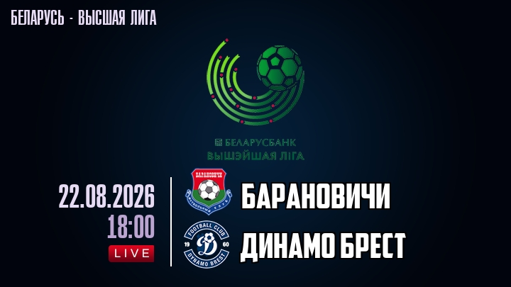 22 августа 2026 года, мы предлагаем посмотреть онлайн трансляцию футбольного матча между футбольным клубом Барановичи и футбольным клубом Динамо Брест, проходящего в рамках Высшей лиги Беларуси.
