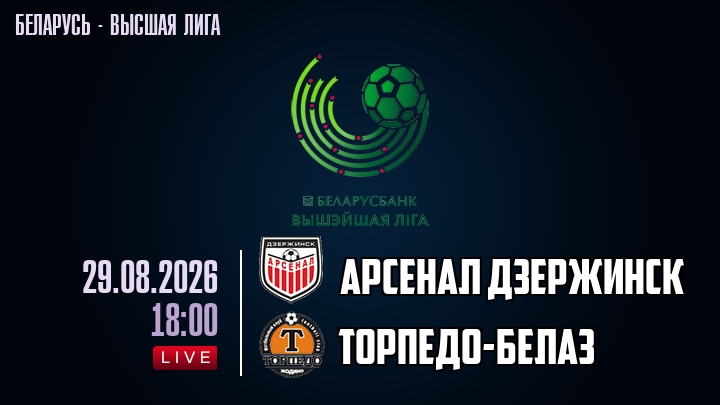 29 августа 2026 года, мы предлагаем посмотреть онлайн трансляцию футбольного матча между футбольным клубом Арсенал Дзержинск и футбольным клубом Торпедо-БелАЗ, проходящего в рамках Высшей лиги Беларуси.