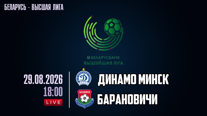 29 августа 2026 года, мы предлагаем посмотреть онлайн трансляцию футбольного матча между футбольным клубом Динамо Минск и футбольным клубом Барановичи, проходящего в рамках Высшей лиги Беларуси.